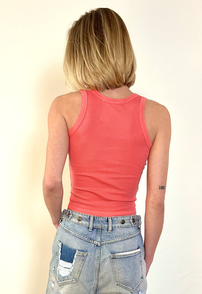 Raw Edge Binded Scoop Neck Tank. The cut edges on the wide binding creates a raw unique look and turns a standard tank into a fashion essential. All seams are sewn with reverse thread for a unique look and adding strength as well. Our DNA Luxe Rib fabric is specialty knitted with our proprietary DNA Spandex for a natural stretch with great recovery which you will not find elsewhere in the marketplace.