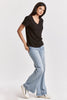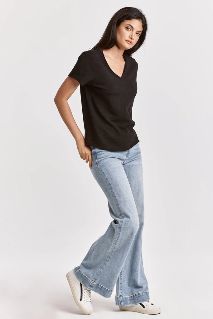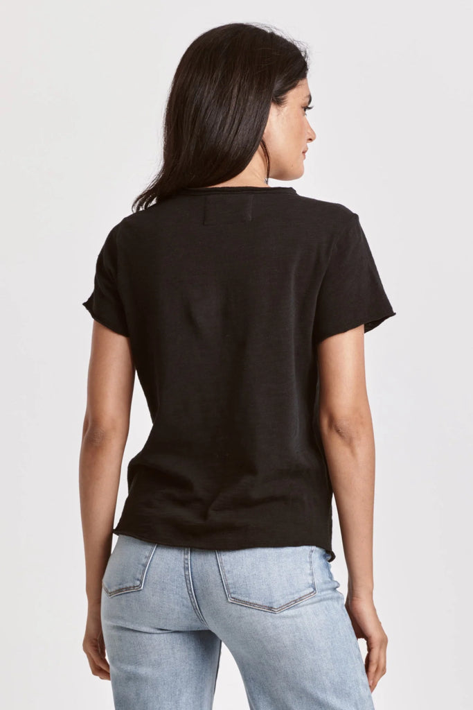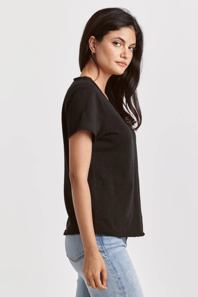 Short sleeve slub tee, v-neck with raw edges & patch labeling. The trendy piece that radiates your flair in soft & texture fabric, with a vintage wash touch... Solid color knit on relaxed fit.