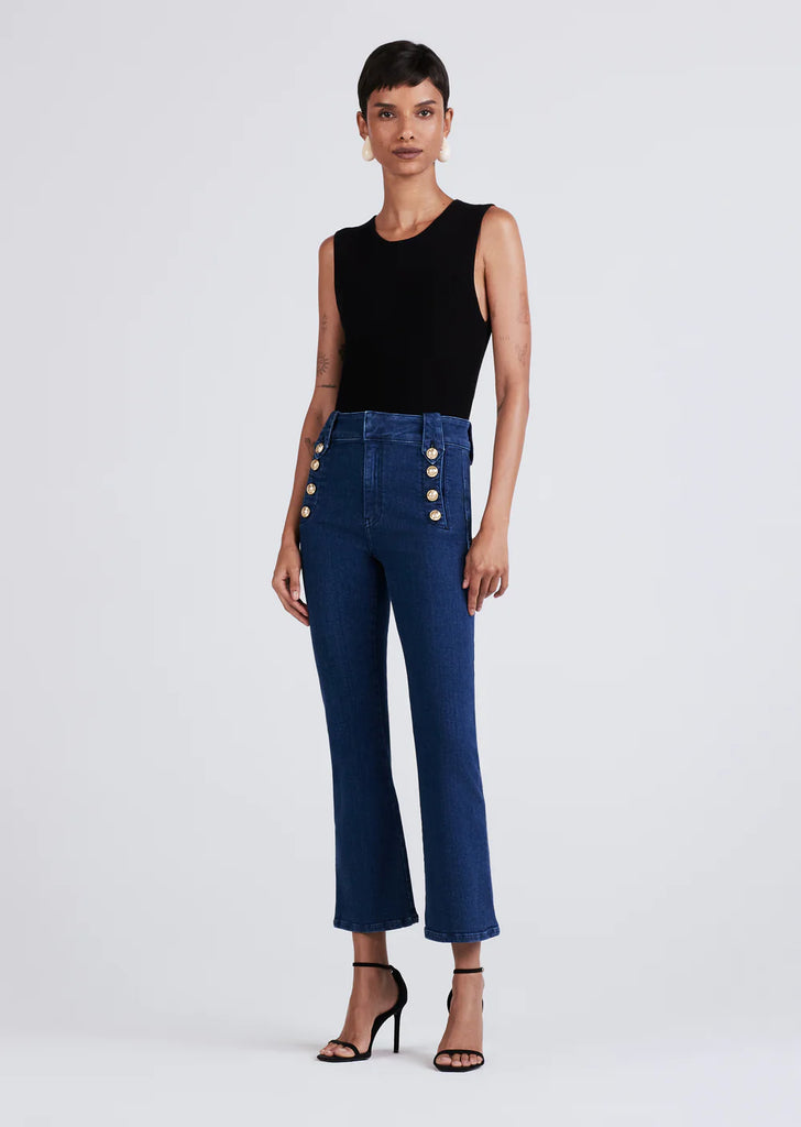 iconic cropped trouser with gold sailor button details along the hips is updated this season in a premium comfort stretch Italian denim with a stone-wash finish. Zip fly with button closure, flat front, tonal buttoned belt loops and stitching.