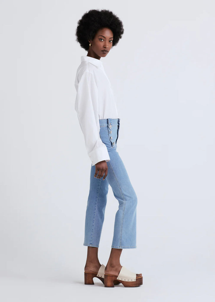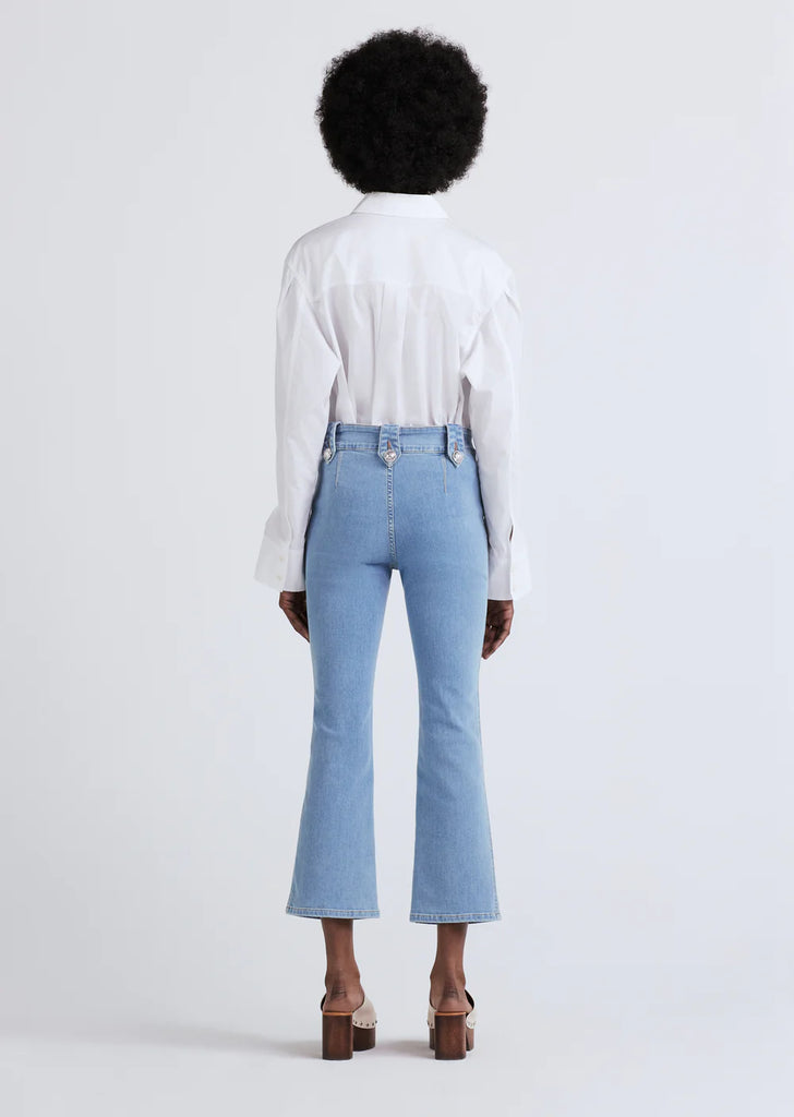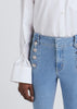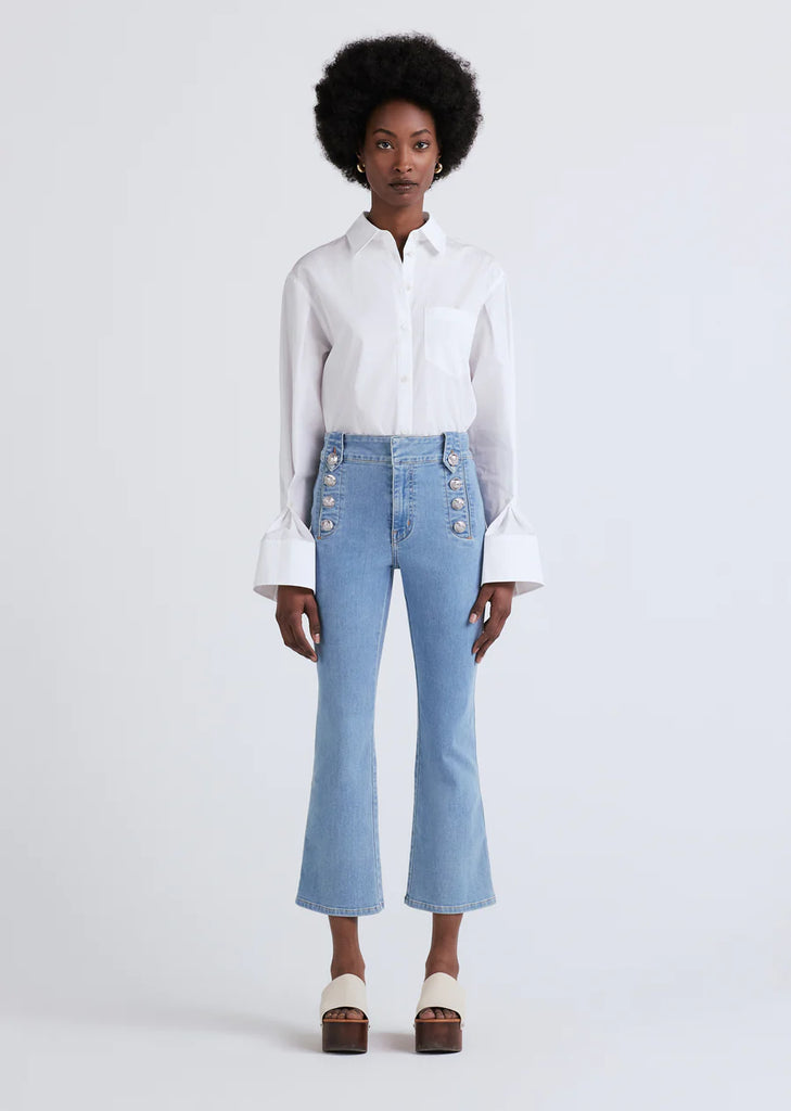 The iconic cropped pant with sailor button details along the hips is updated this season in a premium comfort stretch Italian denim and a soft light wash. Zip fly with button closure, flat front, tonal buttoned belt loops and stitching.
