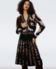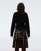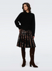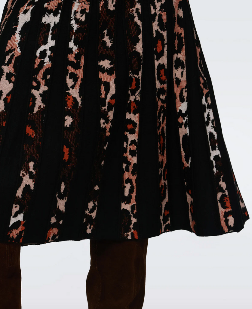 The Hutch skirt has a luxurious, textured feel. Crafted from a wool-blend jacquard, it gives the illusion of pleats by combining solid black and an animal print, falling below the knee.