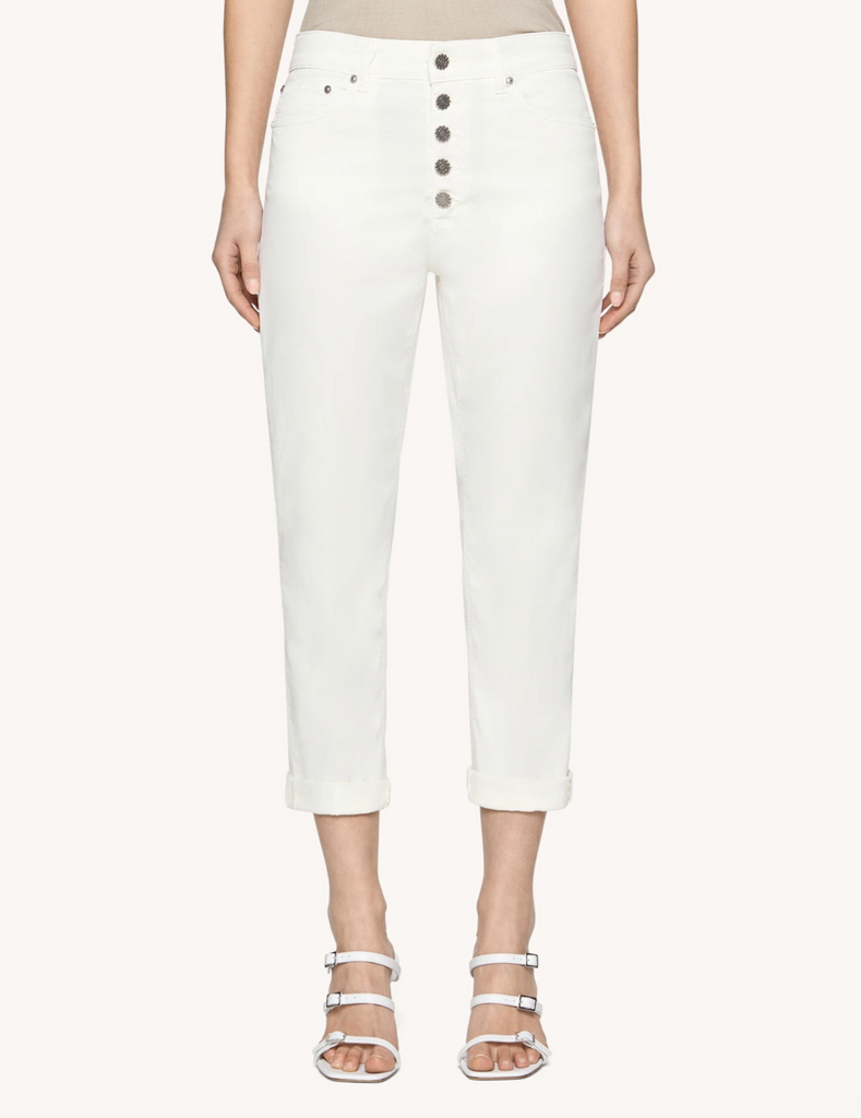 Koons loose-fit five-pocket 30-inch jeans, regular waist, jewel button panel. Light clean wash. Dondup logo. Made in Italy