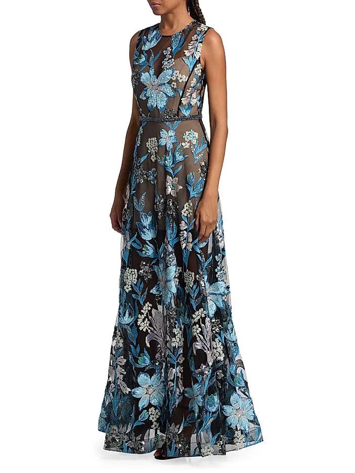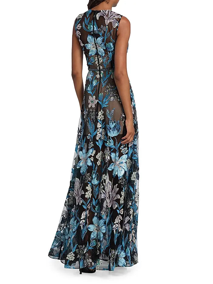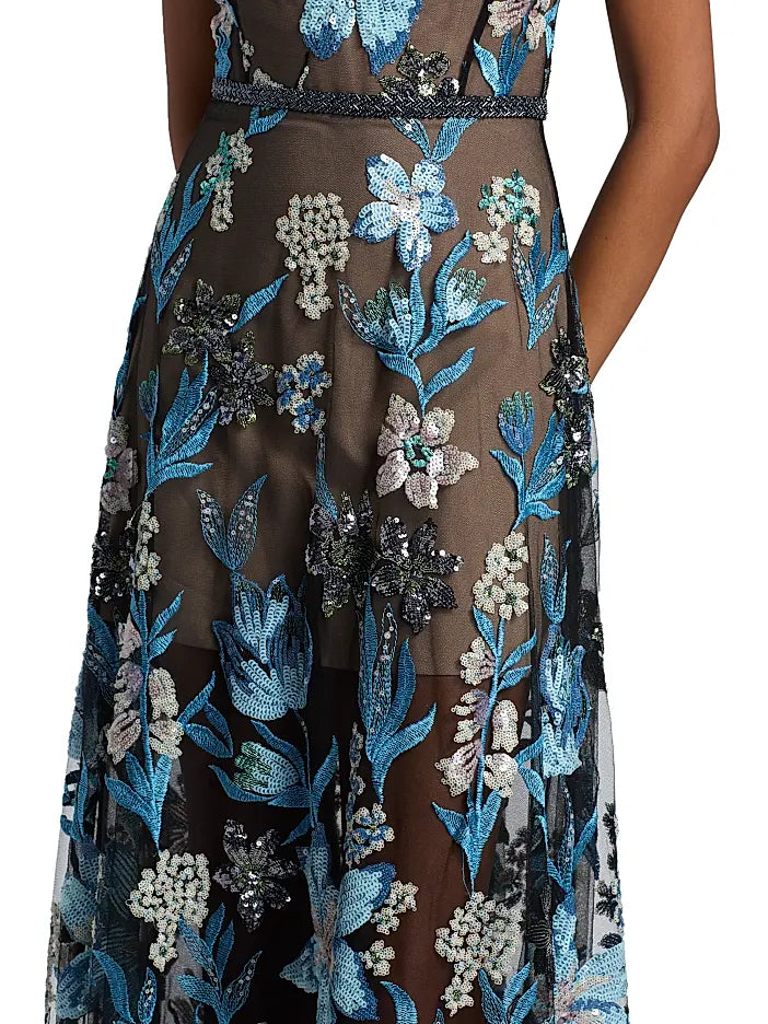 Bronx and Banco's Arielle gown showcases intricate sequin-embroidered florals on semi-sheer mesh. Cut for an A-line silhouette, this style features an illusion sweetheart neckline and a braided belted waist.