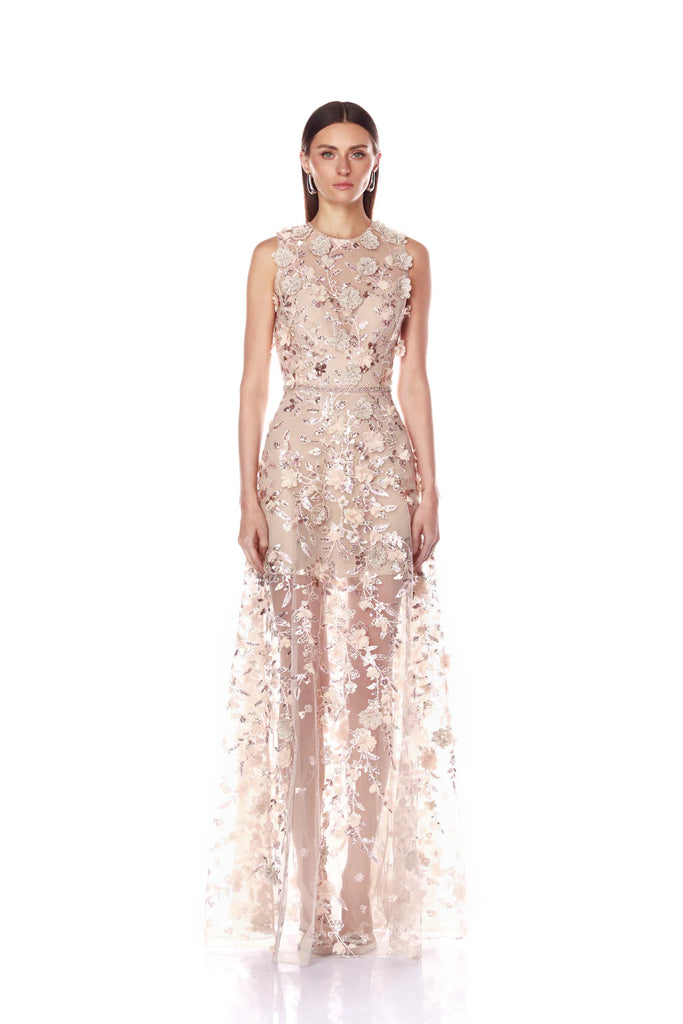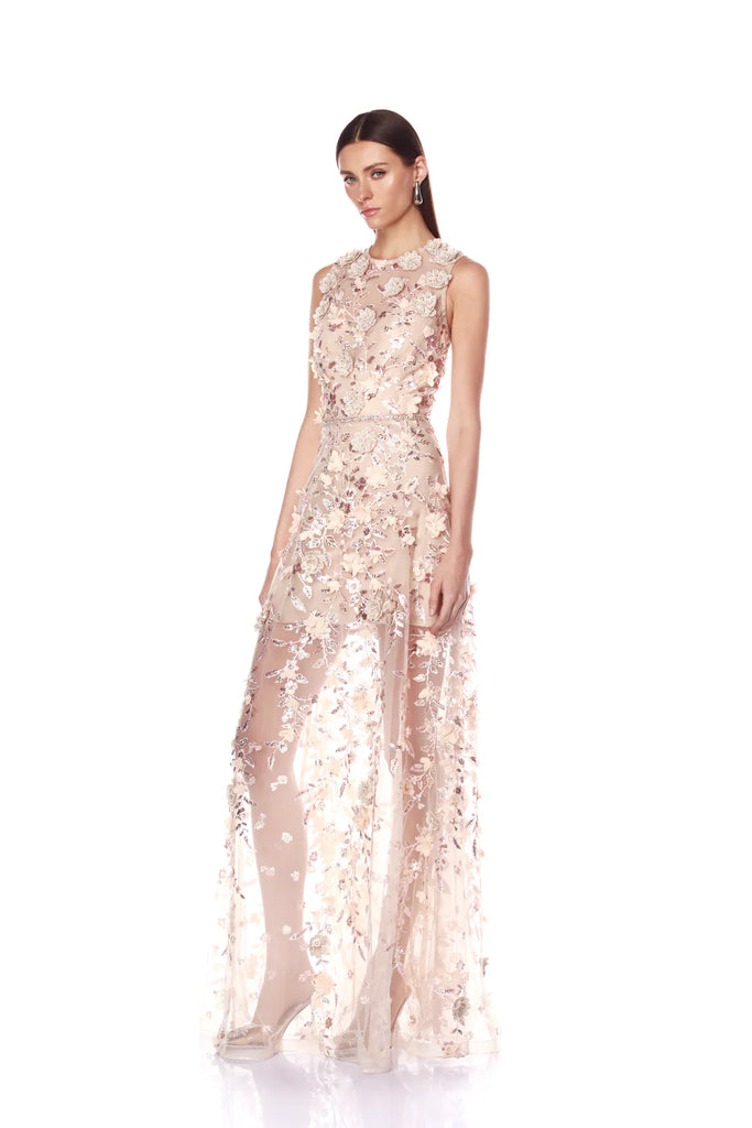 Make an elegant entrance in the Arielle Floral Blush Gown, a romantic and delicate piece for any occasion.