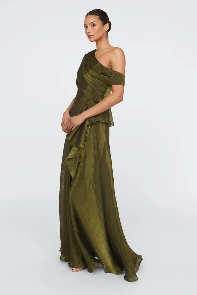 Bonded organza lame with a fluid drape and rich sheen. Designed with sculptural ruching and a soft peplum overlay. A standout in deep olive—perfect for evening celebrations.