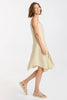 A light linen strappy tank dress with a fun double box pleat detail at front with a sharkbite raw-edge hem. Featuring antique brass hardware and twill tape adroned front pockets.