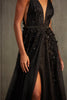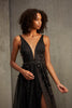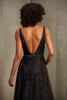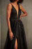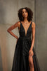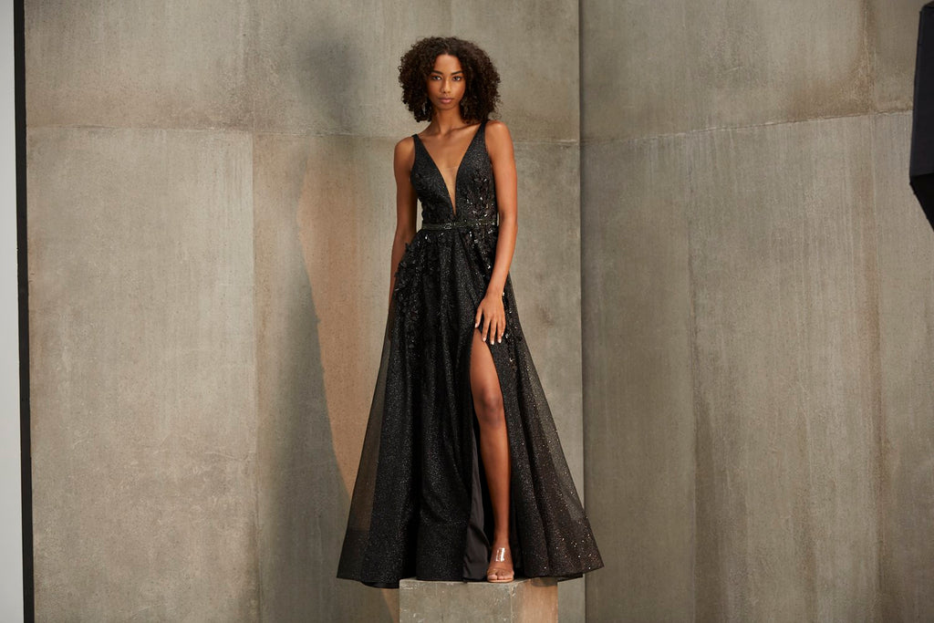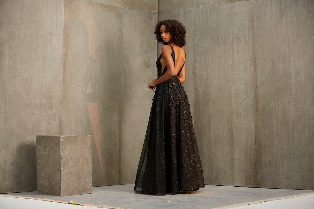 This Floral Appliqué Gown features a fitted bodice, a low back, and high slit for added drama. Sparkle fabric with jeweled belt and black floral appliqué brings a chic, timeless elegance to any occasion. Perfect for showcasing delicate curves and creating an unforgettable look.