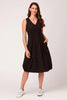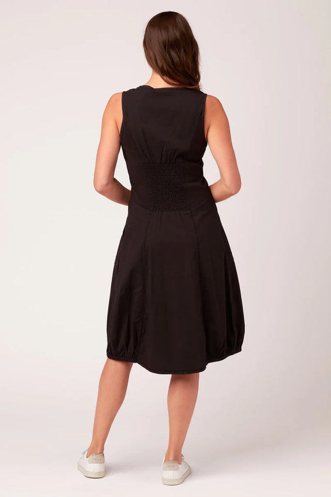 A sleeveless, v-neck midi dress with a bubble skirt, shirring details at front and back, princess line jersey panels for impeccable fit, and two front pockets trimmed with grommets.
