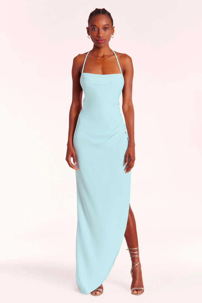 Be a stunning vision in everyone's eyes with the Janet Gown! This showstopping maxi dress features cowl detail at the front neck and back skirt. As well as pleating detail at the left side skirt and crossover straps into tie closure at the back.