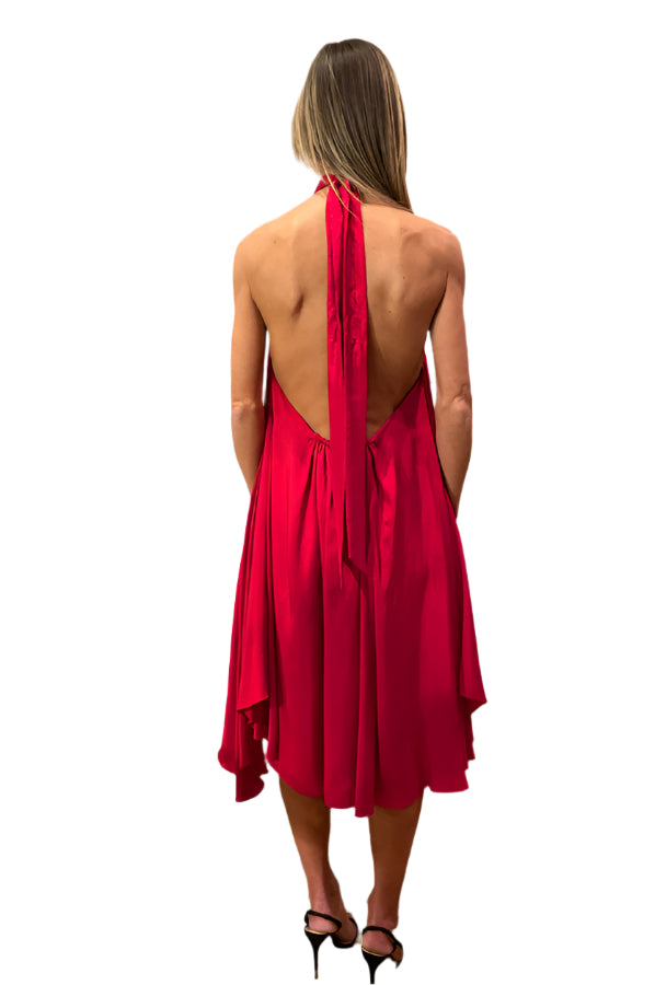 Azeeza dress. Cross neck and tie back for a statement look. High low hem.