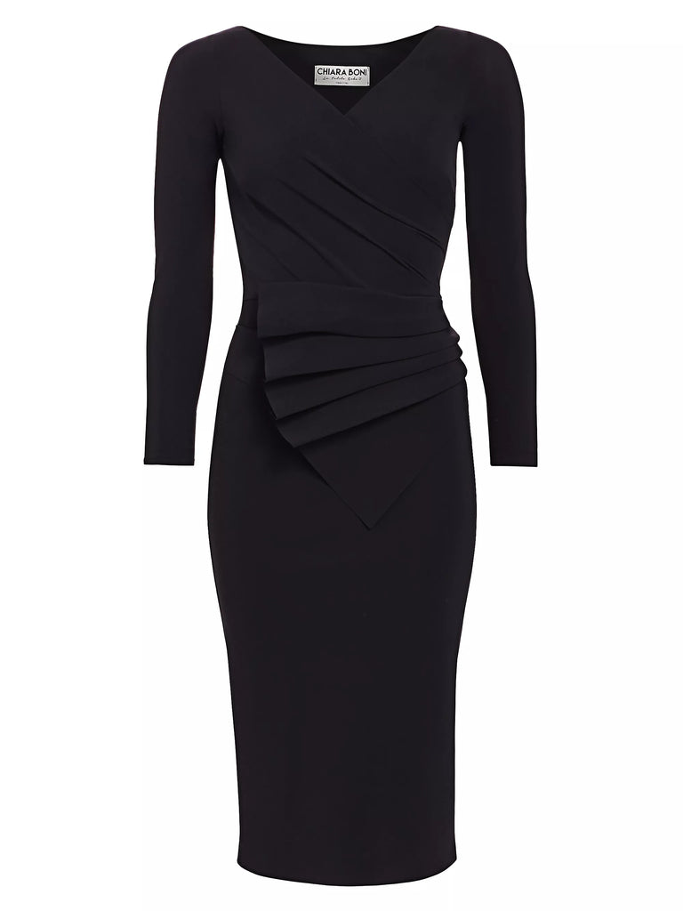Curve-hugging jersey design with a fan of pleats at the waist for added dimension.