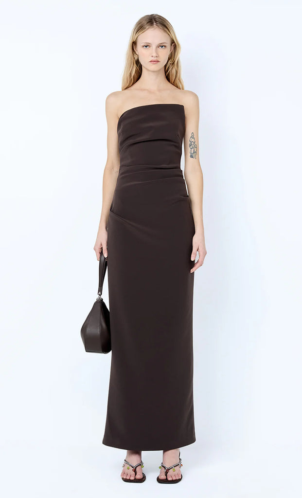 Lior Strapless Dress in Espresso. A sleek strapless dress perfect for evening events, cocktail parties or special occasions.