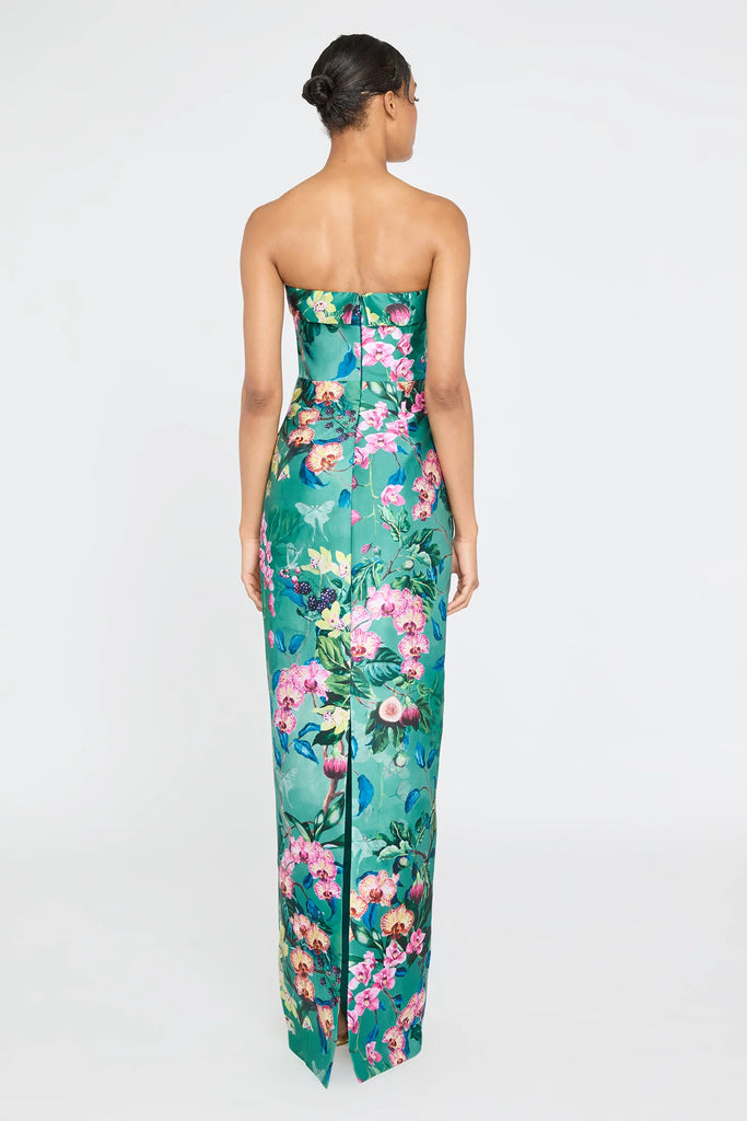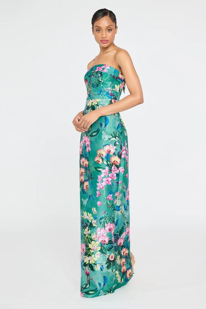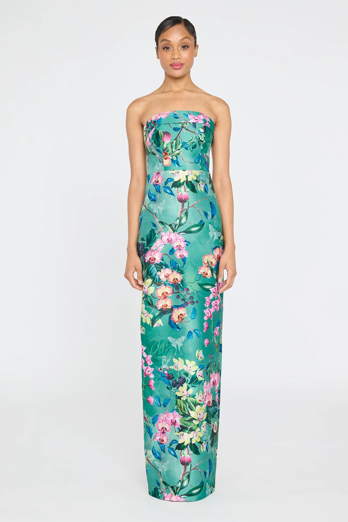 Bold and botanical, the Lulu Gown stuns in a vibrant floral print that feels plucked from a secret garden. Crafted in structured mikado with a sleek, strapless column silhouette, it creates an elegant, statuesque line. A striking choice for summer weddings, formal evenings, and moments made to leave an impression.
