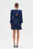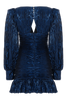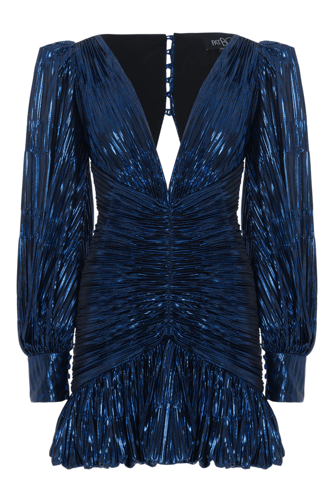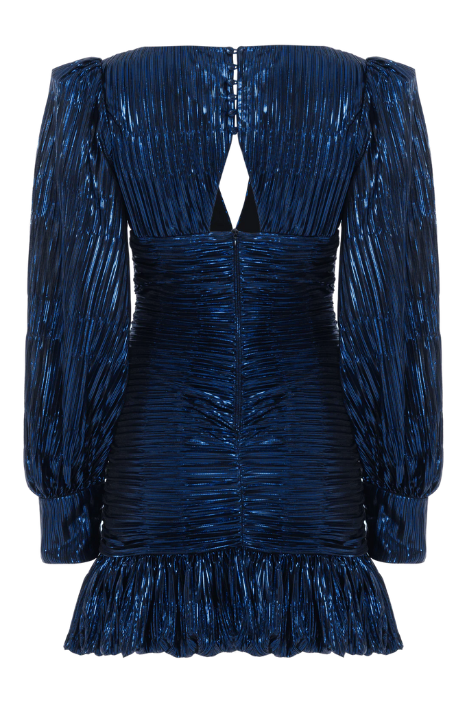 Crafted in a luminous blue pleated fabric, it features a deep V-neckline and bold shoulders that create an empowered silhouette. The ruched detailing through the bodice enhances the shape, while the flounced hem adds a playful, flirty finish. Long sleeves with buttoned cuffs and a small back cutout complete the look with elegance. Perfect for festive nights and special events