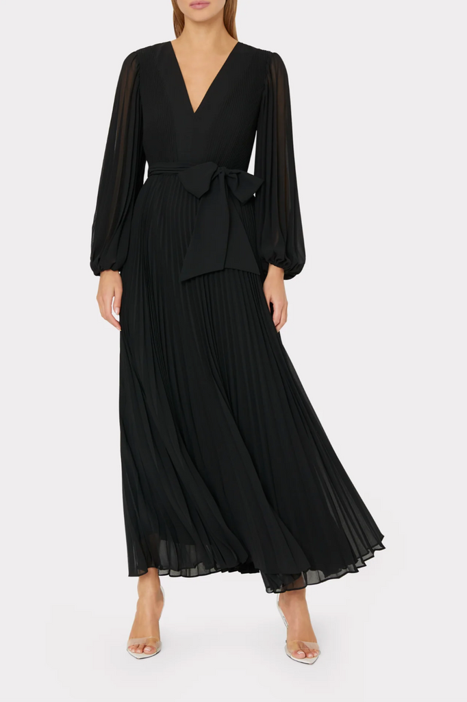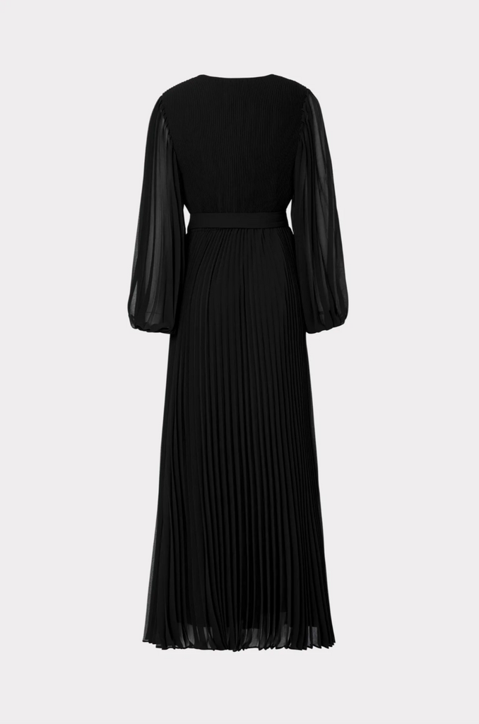 Take a twirl in the Nadie maxi dress that features a v-neckline, an elasticated waist with a tie, with Milly signature pleating throughout. This one really does go from day to night—styled with an easy flat or with a strappy heel and gold jewelry at night.