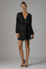 The Polly Sequin Mini Dress has a mid-thigh length, v-neck, and wrap style skirt. It features a gathered, long sleeve and velvet, self tie belt in a stretch, mesh-sequin fabric.