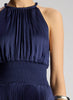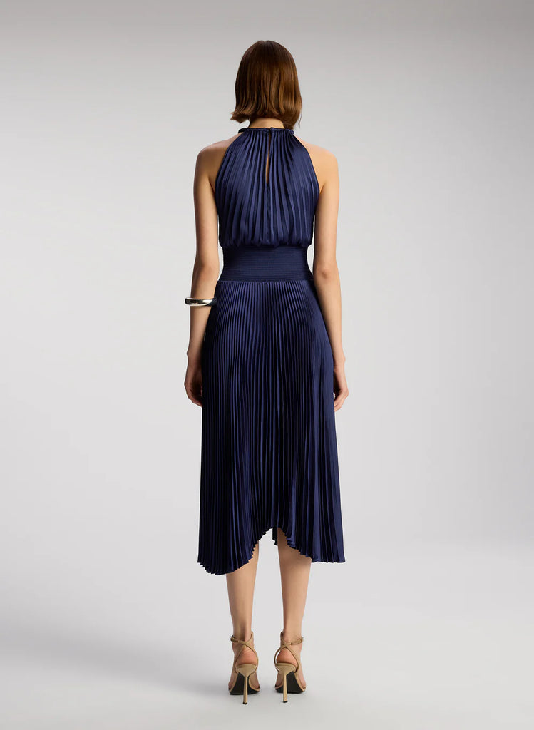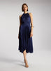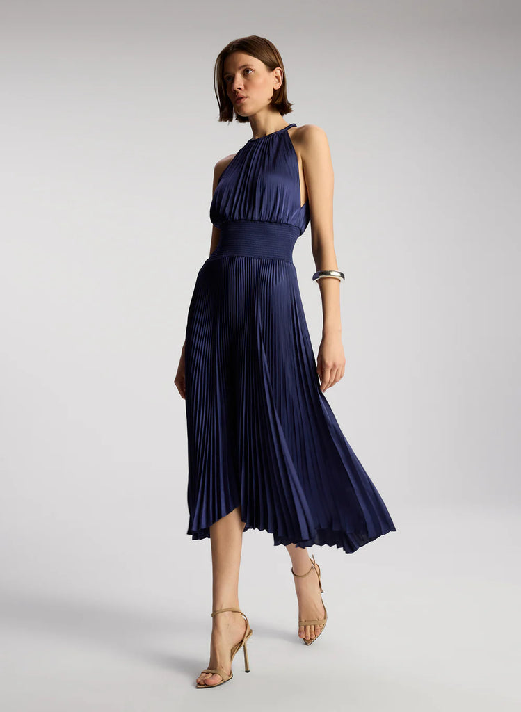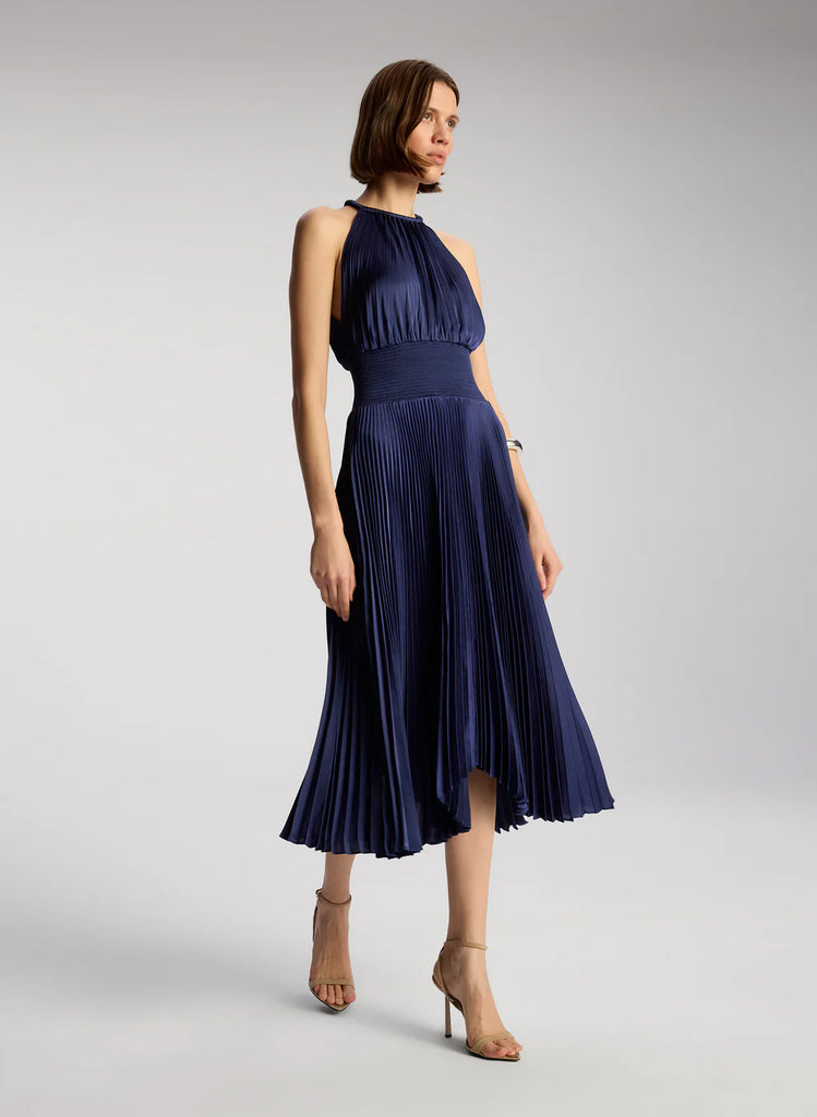 The Renzo II Dress, a part of A.L.C.'s Signature Collection, is made from our vintage satin in a deep riviera blue. This midi silhouette features all-over pleating with a halter neckline and smocked waist.