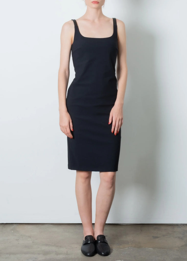 Flaunt your figure with confidence in our ultra-slimming double layered body-con dress. Complete with round neckline, vegan leather strap detailing and wide straps made to conceal undergarments.