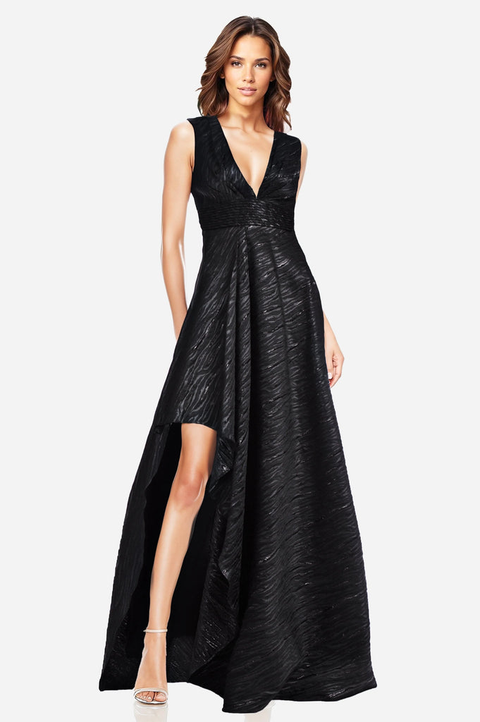 Black animal jacquard ruffle maxi gown with an empire waist, plunging v-neckline, and a leggy side slit.