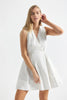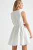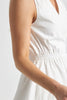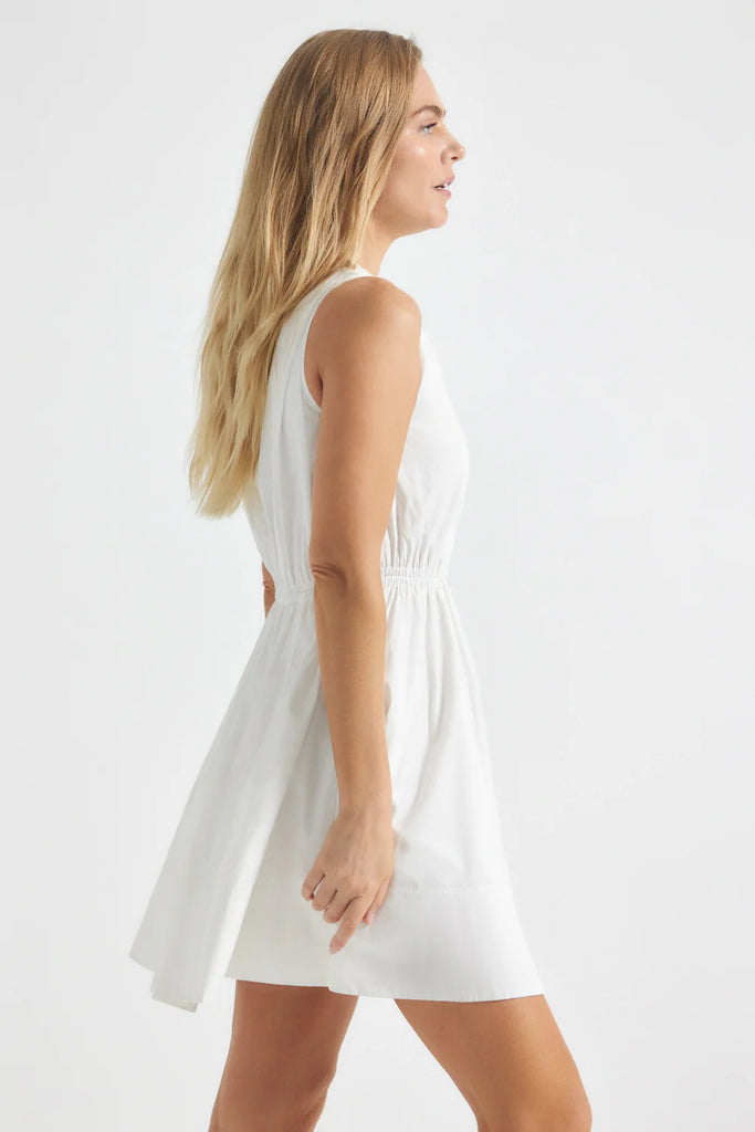 The Tia Dress is a utility style with a wrap neckline, elasticated waistband, and patch pockets. It features an A-line silhouette and patch pockets.