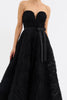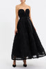 The Willow Midi Dress in black radiates feminine elegance. Tailored from embroidered tulle, it features a strapless sweetheart neckline and a fitted bodice that flatters the figure. Cinched at the waist and adorned with a grosgrain ribbon bow belt, it adds a touch of refined charm. The full midi skirt enhances the graceful silhouette, while the lining and back zip fastening ensure a secure and comfortable fit. Polished and sophisticated, this dress is a perfect choice for your next special occasion.