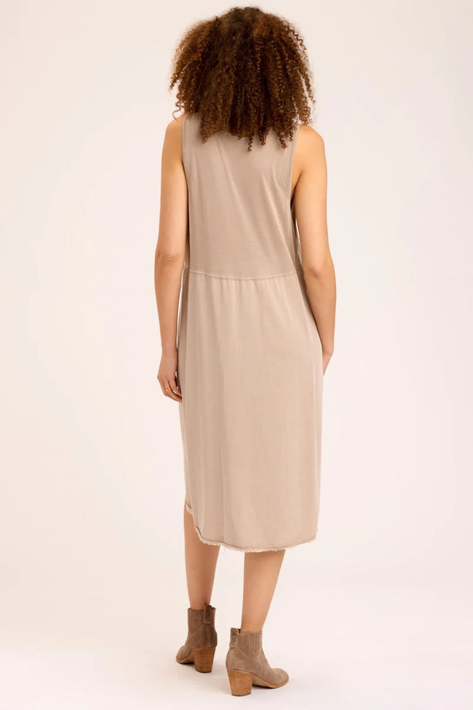 Mixed media at its finest here in the Winesa Tank Dress. Featuring a high low hem, our Taissa Twill in front and back panels, with a cotton jersey shoulder panel and a rib contrast at the front hem. Tack on the back button-up detail and Winesa will have you asking for more!