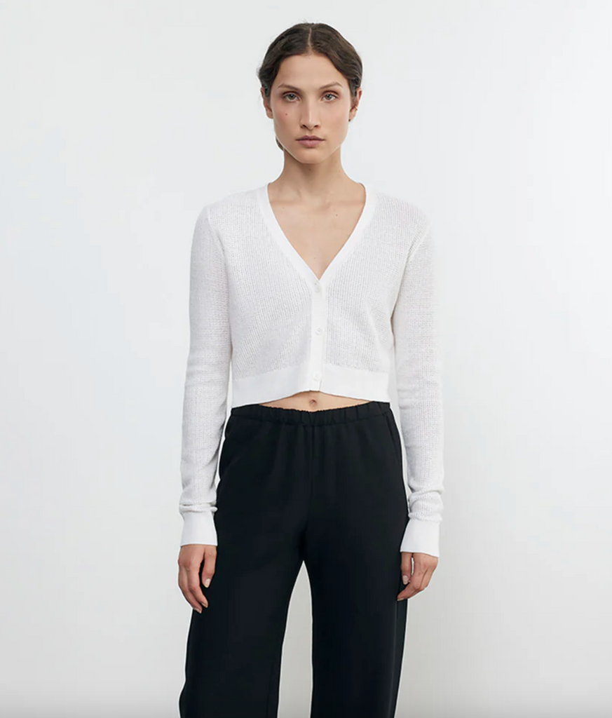 Knit from a lightweight linen cotton blend in an open stitch, its breathable texture and cropped design make the Open Knit V-Neck Cardigan the perfect layering piece.