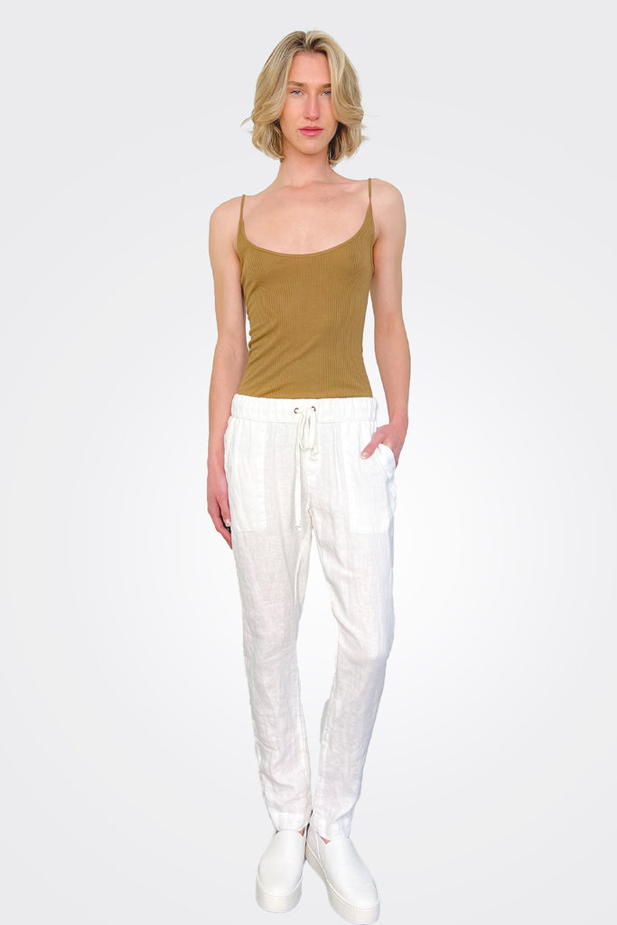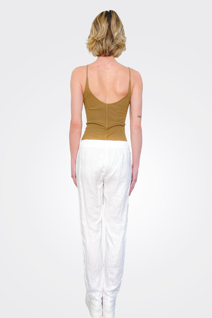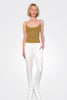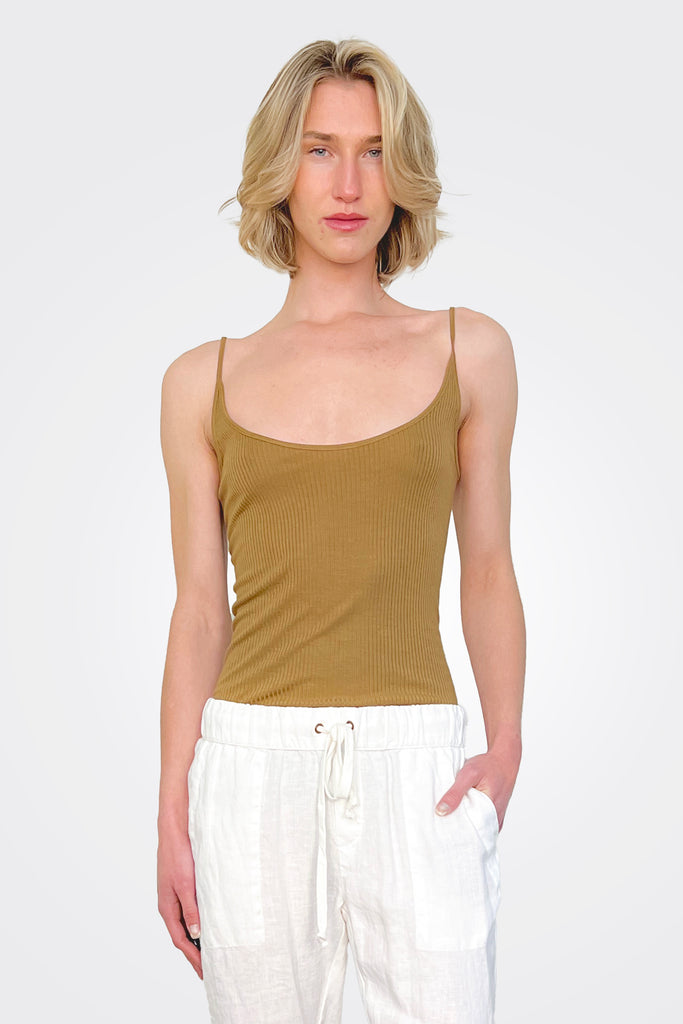 Enza Costa Rib Essential Tank in Brown. 90% rayon 10% silk. Made in USA. Hand wash. Lightweight ribbed jersey fabric.