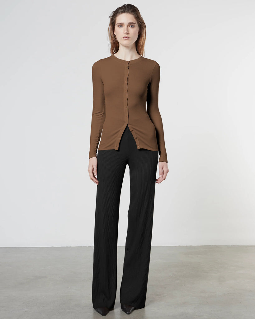 An essential piece for the transitional wardrobe, this cardigan is cut from soft silk rib fabric. It offers a body-hugging fit with flattering stretch, featuring the brand's signature center back seam and shell button placket closure. Wear this versatile piece layered or on it's own.