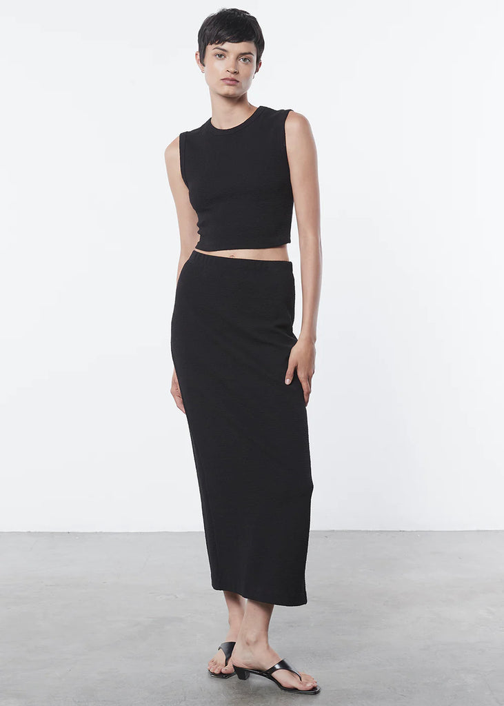 Fitted muscle tank featuring a comfortable cropped length. Crafted from an intricate pebble texture jacquard in a cotton blend.