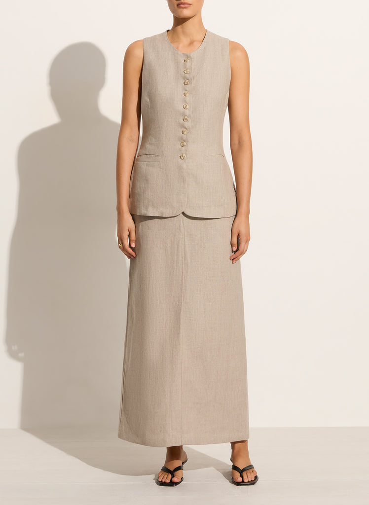 Softly tailored in 100% linen, the Domenico Vest Top is a feminine, vintage-inspired silhouette featuring a high round neckline, button front detail and an adjustable back strap to cinch at desired. Finished with a side pocket detail and fully lined for extra coverage.