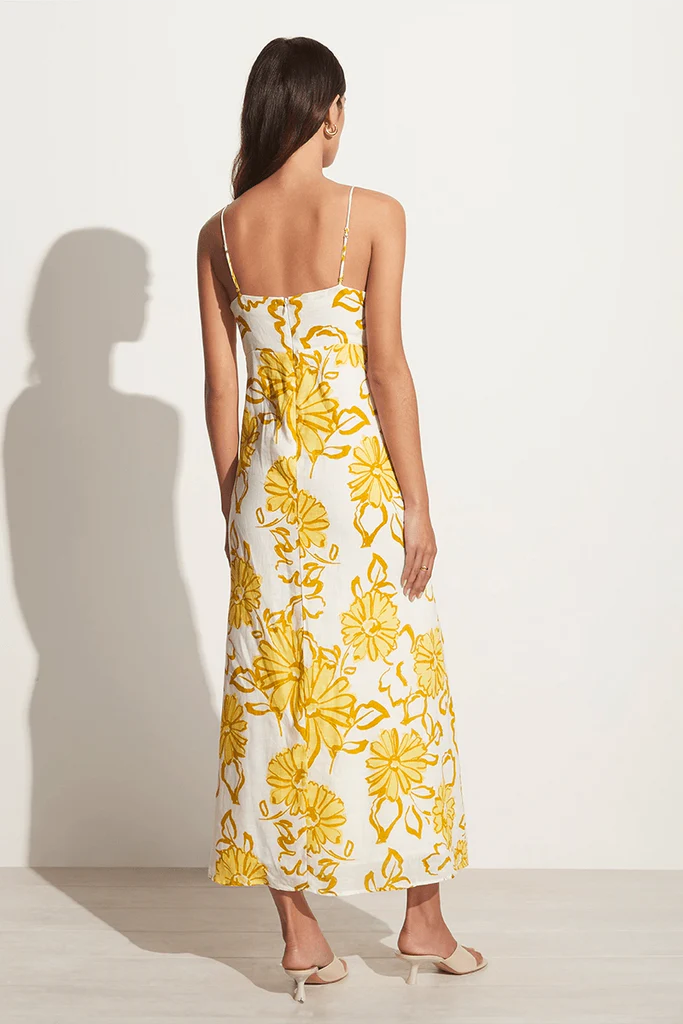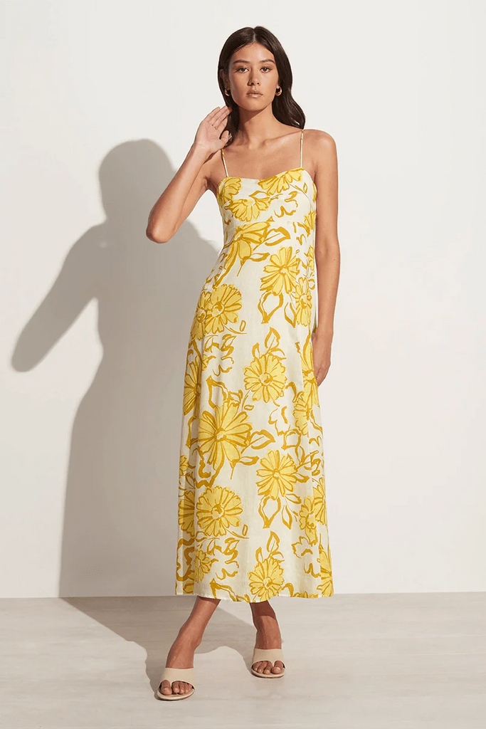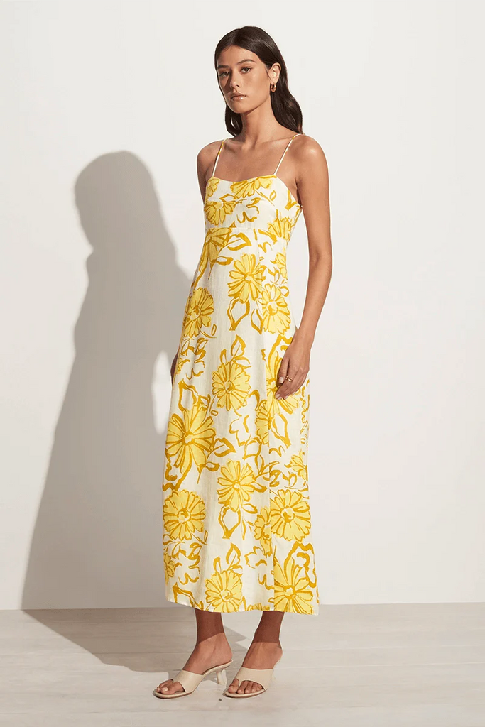 A relaxed and romantic silhouette, the Sorso Midi Dress boasts a sweetheart neckline, thin straps and a flowing full skirt. Made from responsibly soured linen, hand-printed with large florals in sunshine yellow hues, this piece is designed for any sunkissed occasion. From long lunches to golden hour get-togethers, arrive in style to any occasion in this summer-evoking midi.