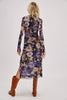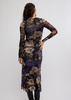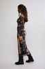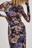 Features: Mesh fabrication with a stretchy feel, floral print design, fitted long-sleeves, gathered waist with twisted detailing, exaggerated leg slit