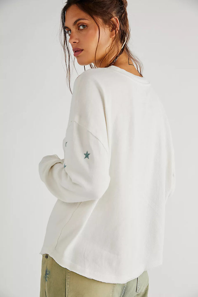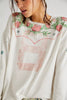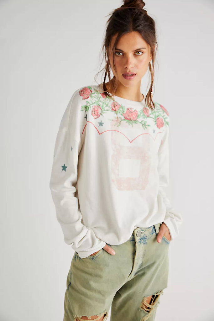 Features: Varsity-inspired graphics, floral pattern at the neckline, vintage-inspired wash