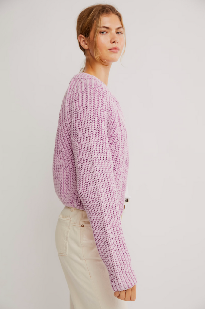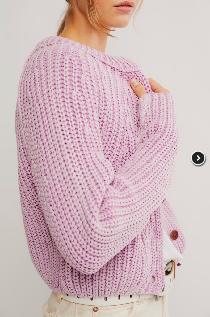 Features: Defined neckline, chunky knit fabrication, button-front closure