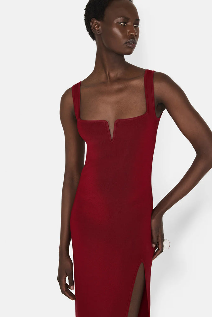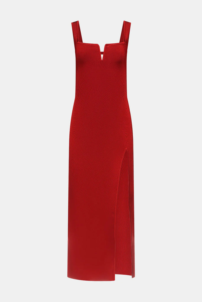 Featuring Galvan’s signature neckline, the Freya dress is made from a body-hugging ribbed knit that supports as it sculpts.