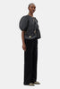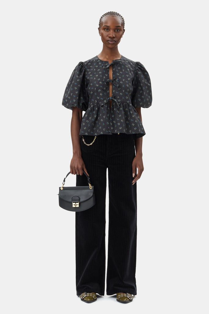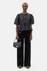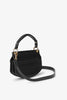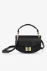 This Black Black Mini Top Handle Apo-G Bag features a magnetic closure with a GANNI Butterfly gold-tone clasp and a detachable strap and top handle, allowing for versatile wear as a shoulder bag or clutch. The compact interior has a slip pocket and three main compartments, one of which has a zip closure.