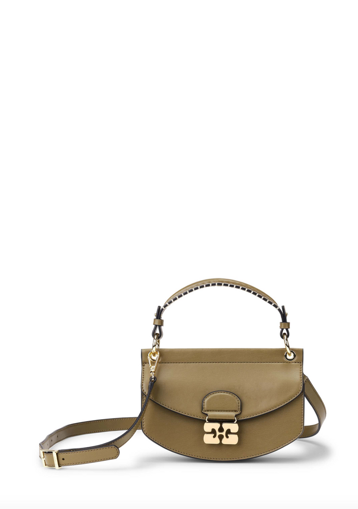 This Caramel Black Mini Top Handle Apo-G Bag features a magnetic closure with a GANNI Butterfly gold-tone clasp and a detachable strap and top handle, allowing for versatile wear as a shoulder bag or clutch. The compact interior has a slip pocket and three main compartments, one of which has a zip closure.