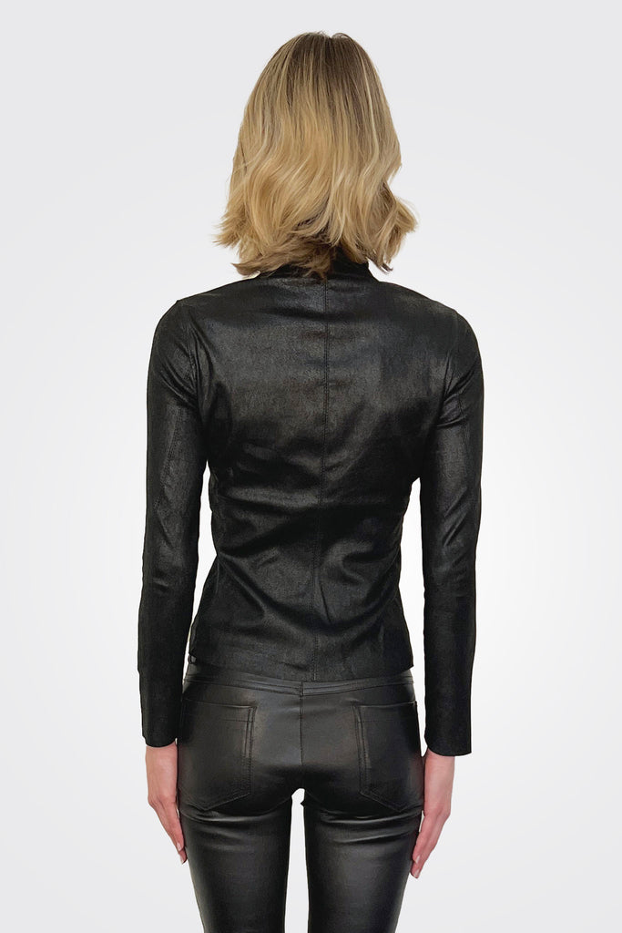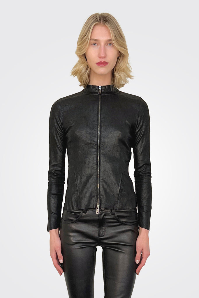 SHORT FITTED JACKET WITH BAND NECK ON STRETCH LEATHER WAXED - CENTRAL ZIP CLOSURE -