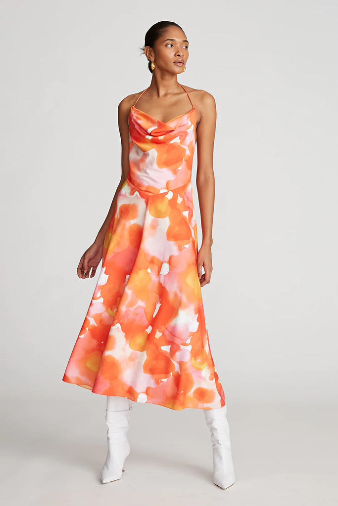 Crafted in our signature crepe de chine fabrics, the Marian dress features a silky-smooth texture with elegant drape. Framed by an alluring neckline, its canvas showcases our refreshing sunset watercolor palette—perfect for making a grand entrance.