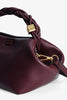 This bag features a tone-on-tone metallic GANNI Butterfly logo, a twisted handle with a braided knot, and a gold-tone metallic dice with a GANNI Butterfly logo engraved. The bag has an internal magnetic closure, a flat card pocket inside, and an adjustable and removable shoulder strap for crossbody wear.