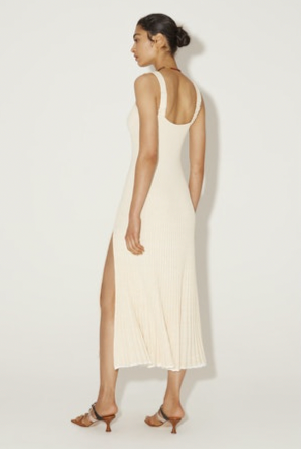 This gorgeous statement dress is a fully fashioned knit, and the perfect piece to dress up or down. The fitted v-neckline and elasticated straps make this super comfortable supportive style and the ribbed texture hugs the figure through the bust and waist. The leg split and width through the hemline make create amazing movement when worn.