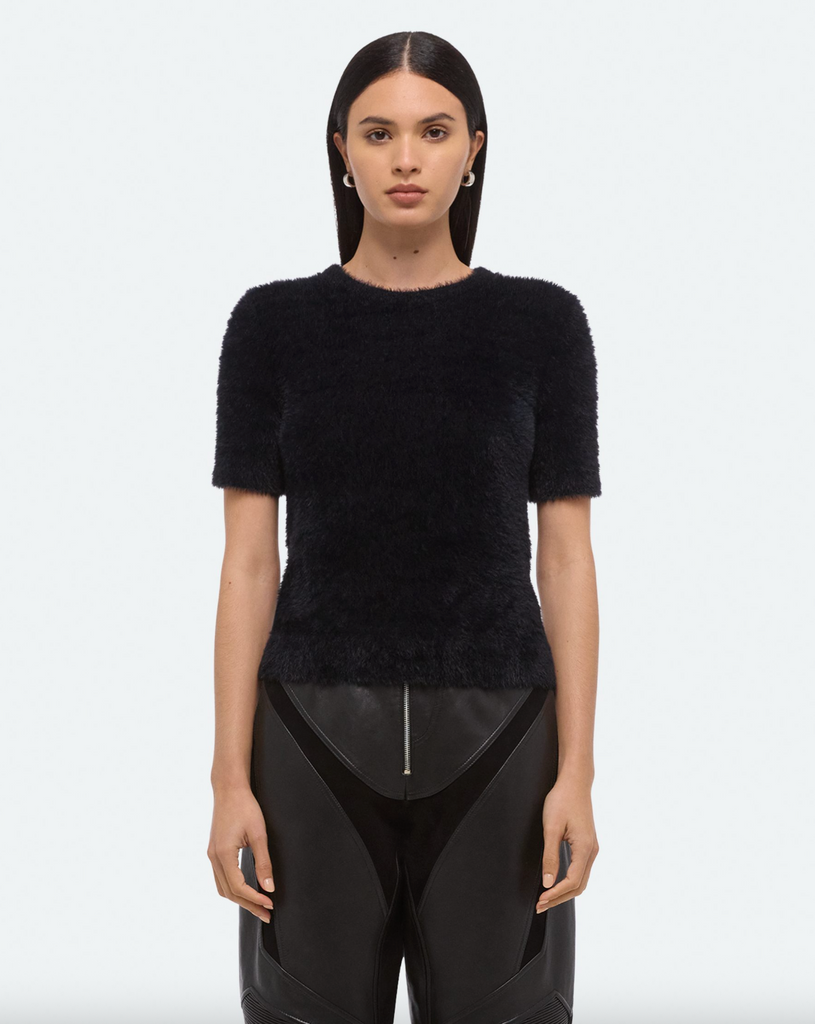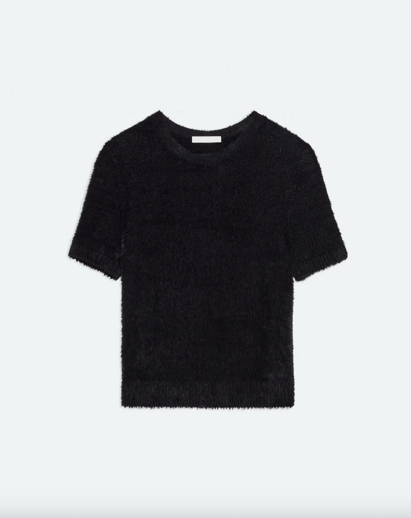 Knit baby tee in a feathery eyelash knit. Matches the Sweater Mini Skirt.