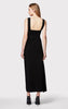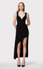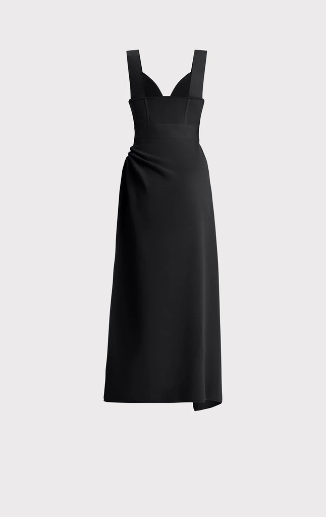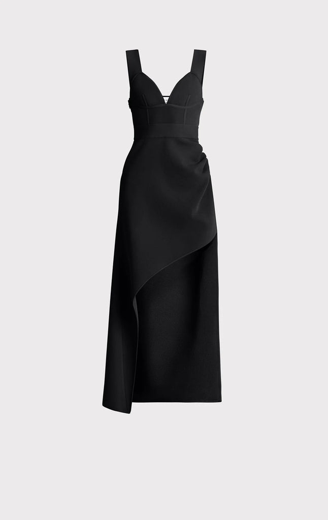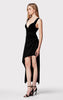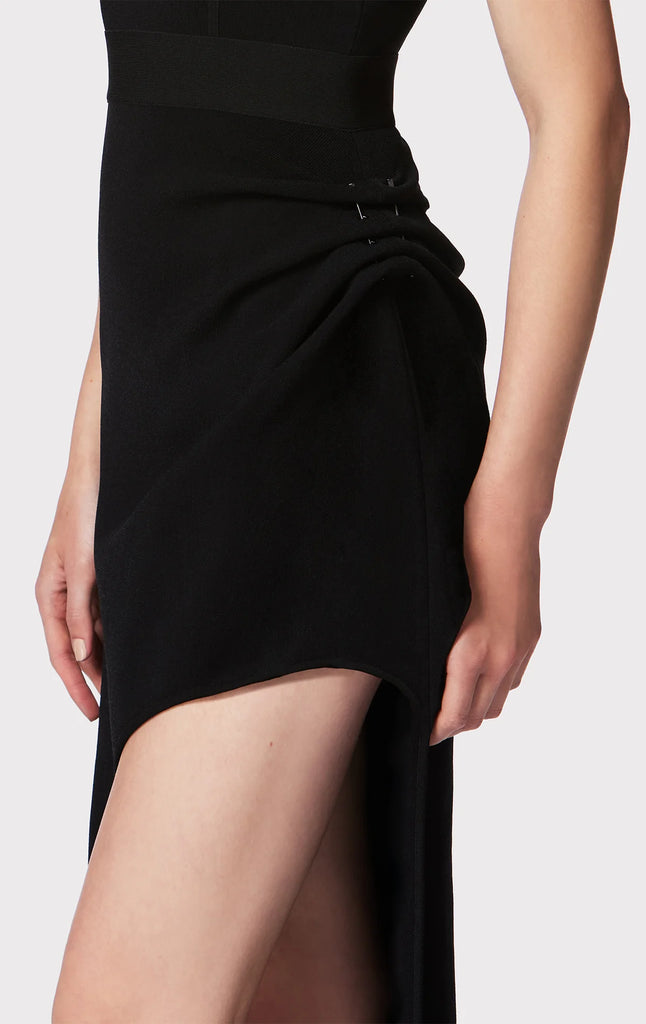 Featuring pleating detail and gunmetal pin hardware, this midi is crafted in a body-skimming silhouette with a signature bodycon bodice. Deep plunge neckline, wide straps and asymmetrical hem complete the look.