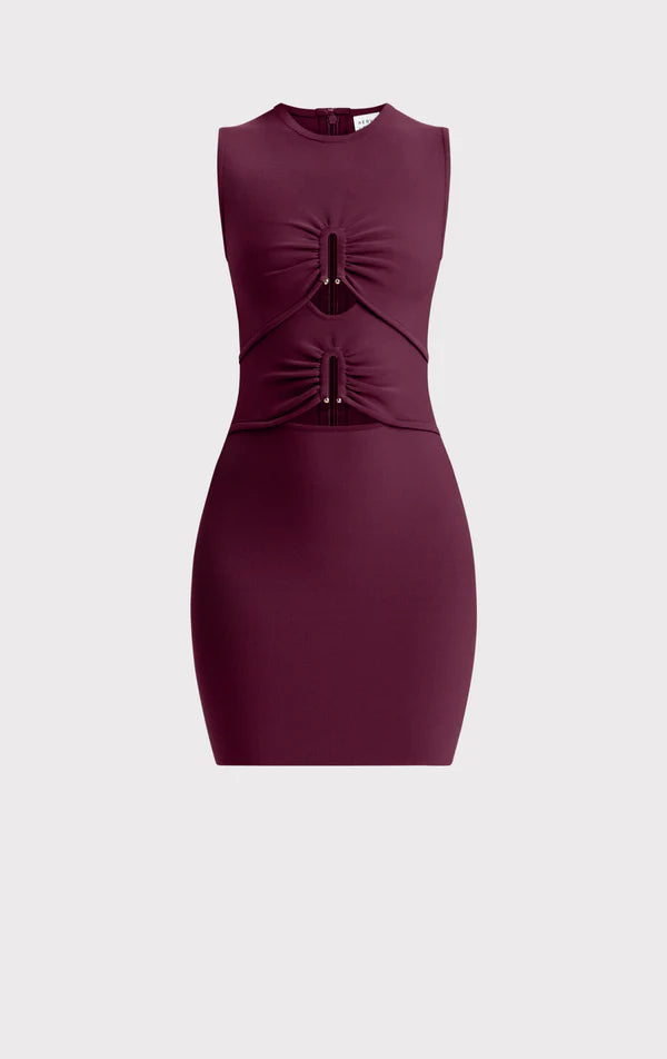 Featuring petite center cutouts and hardware accents, this Fall '24 bodycon mini is designed to shape and sculpt the body. With a matte finish and flattering gathering across the bodice, the June Dress is finished with a center-back zip and made with eco-friendly recycled yarns.