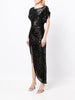 - Sequin embellishments, dolman sleeves with dropped armholes, ruched side, high front split, fully lined