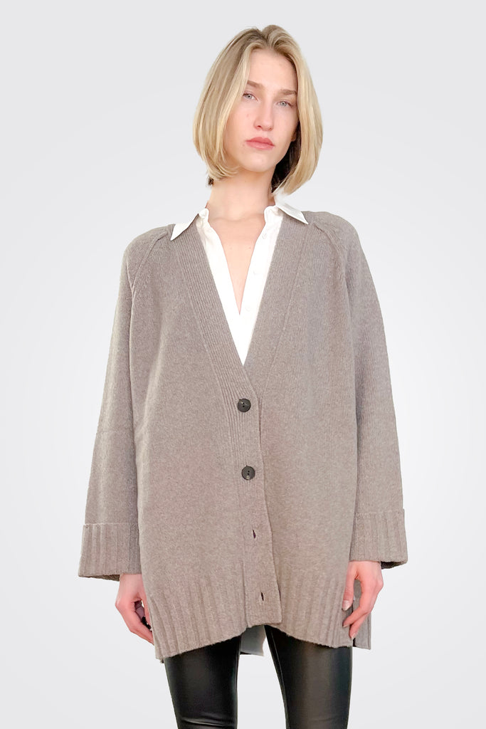 Eco cashmere oversize cardigan buttons closure split at the side.Oversize fit50% Cahmere 50% Wool