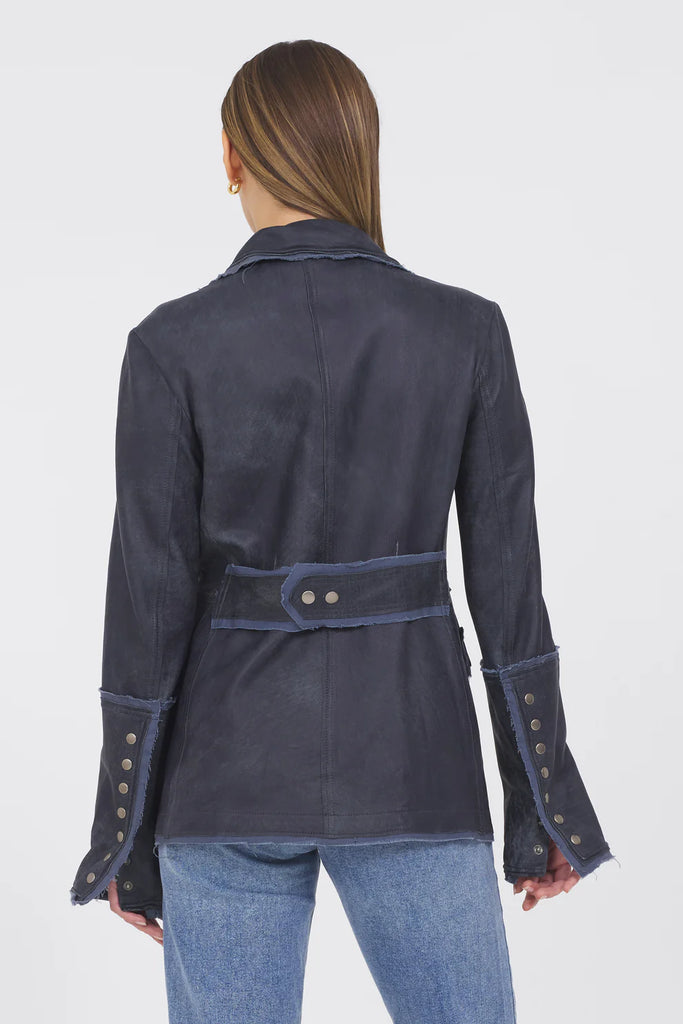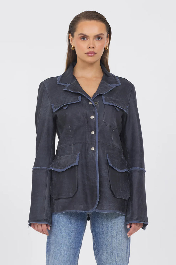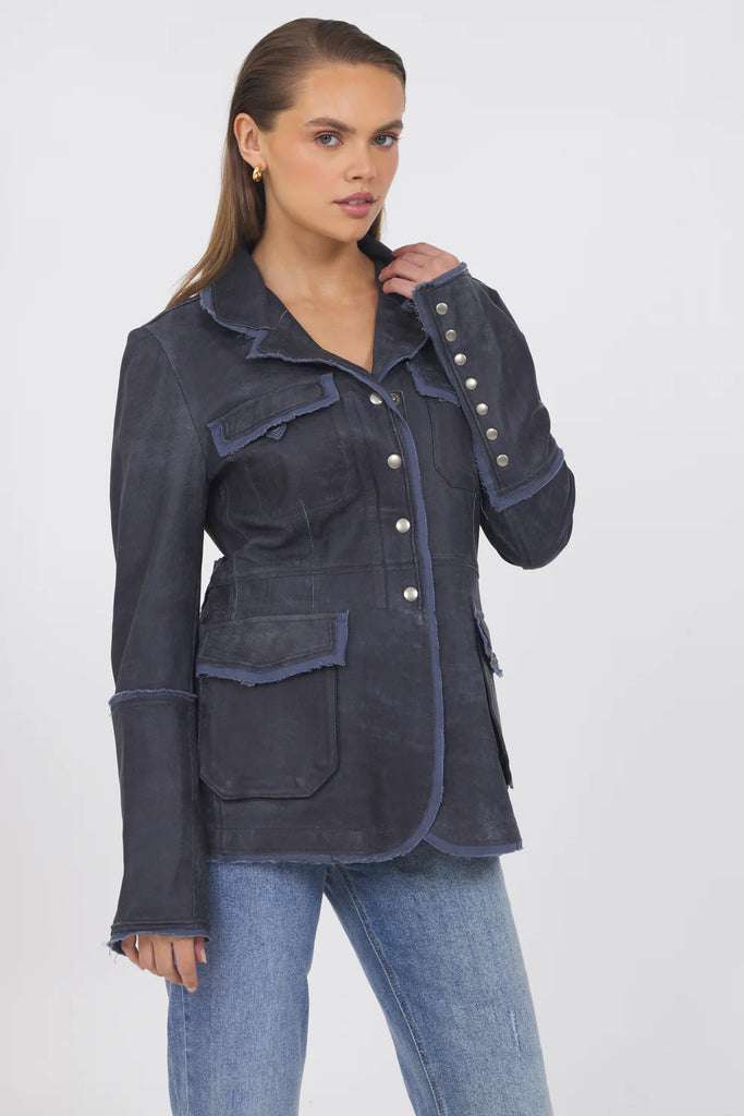 Snap it up.  A long-line, slim fit vintage look with deconstructed fringe seam detailing marries rough and ready style with soft sophistication.  Pair with your favorite jeans and a tank and be ready to be seen.