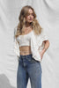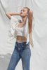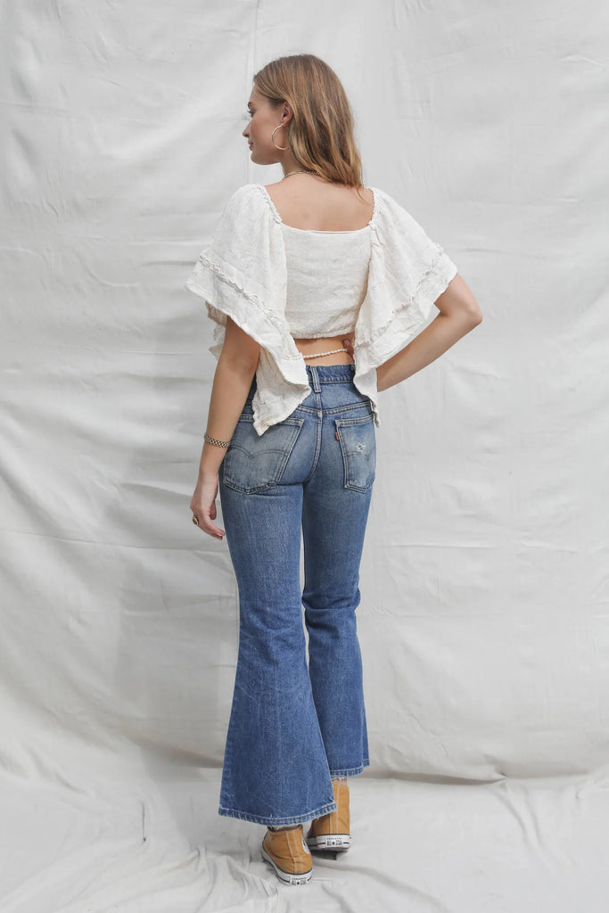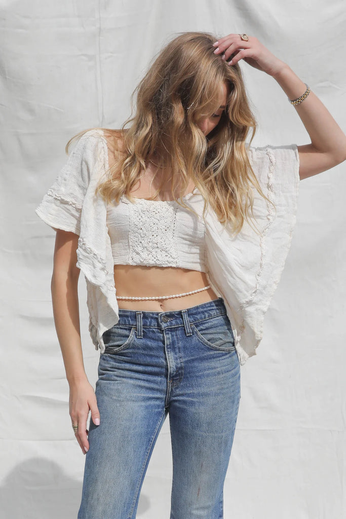 Showoff in our Showdown Top! Crafted from our signature classic gauze, this crop features dramatic flutter sleeves that give off an etherial energy. The bodice is accented by lace paneling for added texture and dimension. Pair with dramatic bellbottoms, your go-to denim, or steal the show and style it with micro-shorts and tall boots.