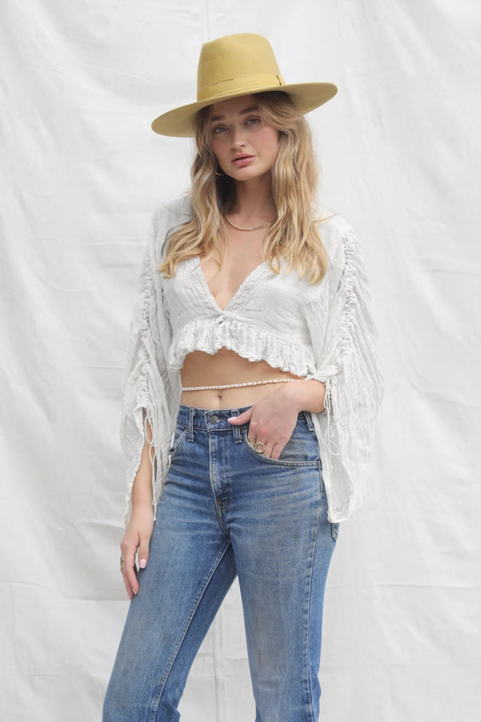Channel your inner boho rocker in our Starlit Crop Top. Crafted from our signature cotton gauze, this lightweight crop features a v-neckline, ruffle hem, and dramatic long sleeves with adjustable ruching.